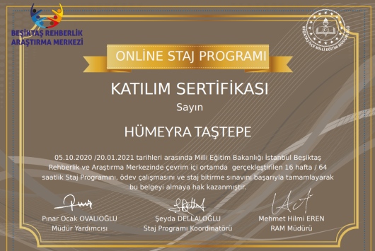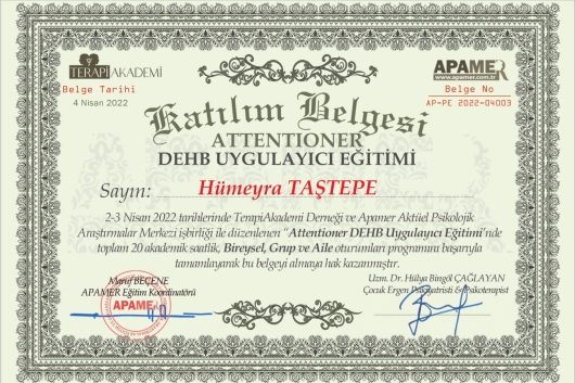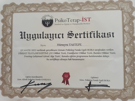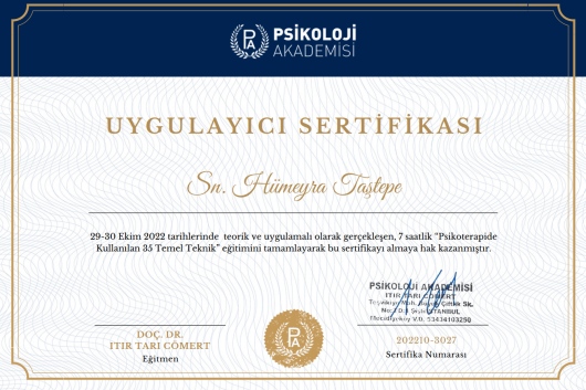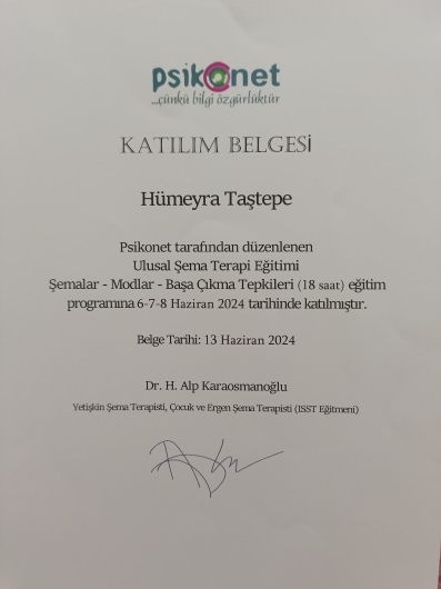 Merhaba, ben Psikolog Hümeyra Taştepe. Lisans eğitimimi KKTC Doğu Akdeniz Üniversitesi Fen ve Edebiyat Fakültesi Psikoloji bölümünde tamamladım. 2020 yılında içinde bulunduğumuz pandemi dolayısıyla İstanbul Beşiktaş RAM 'de online olarak staj yaptım. Çanakkale Onsekiz Mart Üniversitesi Pedagojik Formasyon Eğitimini tamamladım. Şuan aynı üniversitede Disiplinlerarası Davranış Bilimleri yüksek lisans tez aşamasındayım. Bunun yanında 2024 yılında Anadolu Üniversitesi Açıköğretim Sosyal Hizmetler bölümüne başladım. 1.5 aylık bir süre zarfında Çanakkale Psikorem Psikolojik Danışmanlık Merkezinde çalışma fırsatı buldum. Çanakkale Özel Sabire Hatun Özel Eğitim ve Rehabilitasyon merkezinde 2 yıl psikolog olarak çalıştım. Şuan Çanakkale merkezde yüz yüze olarak bir psikolojik danışmanlık merkezinde çalışmakta ve bunun yanında online olarak terapi vermekteyim.