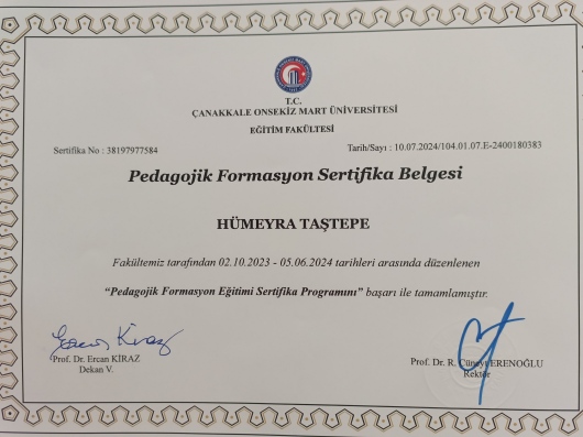 - Çanakkale Onsekiz Mart Üniversitesi Pedagojik Formasyon (2024)